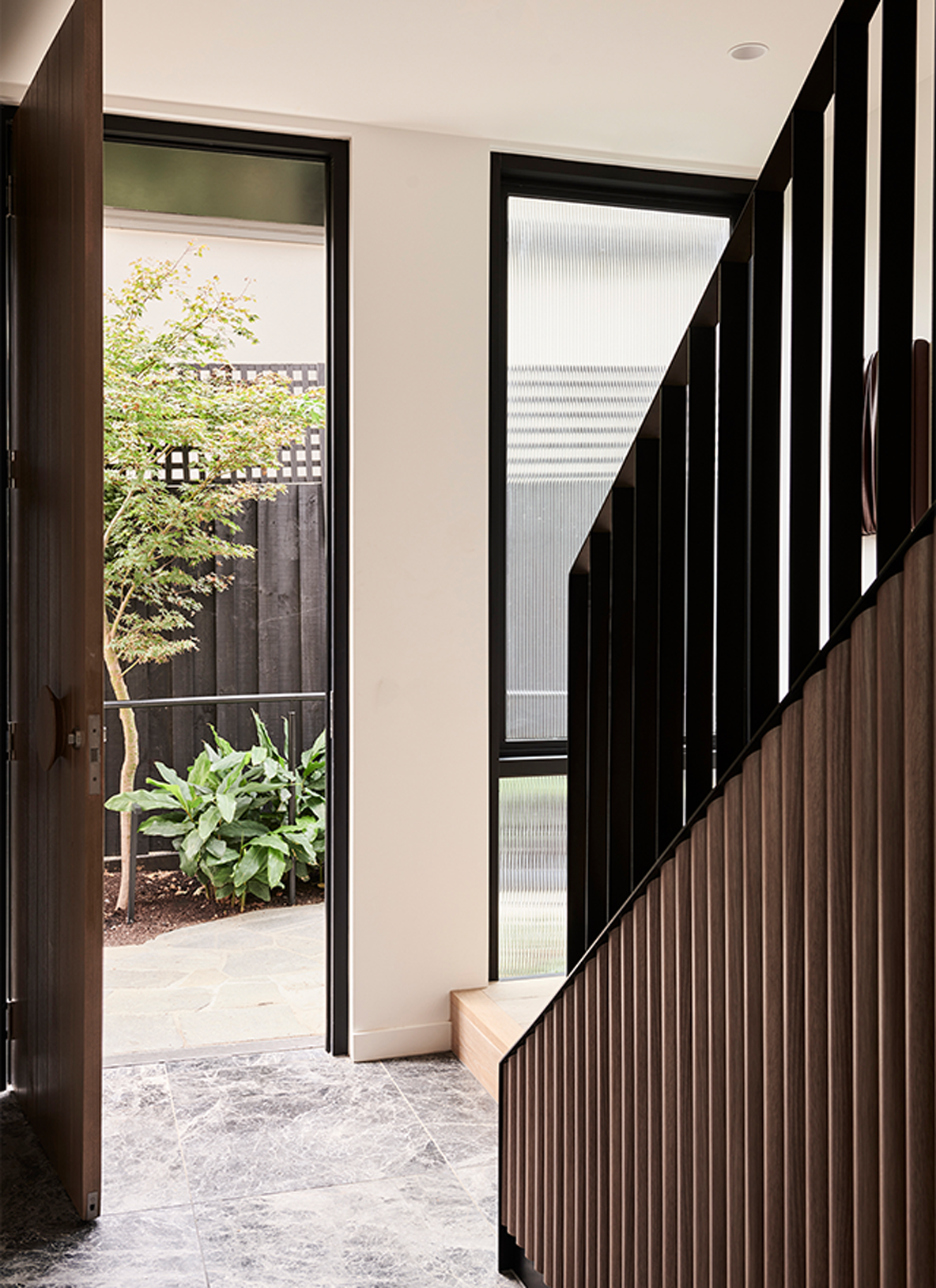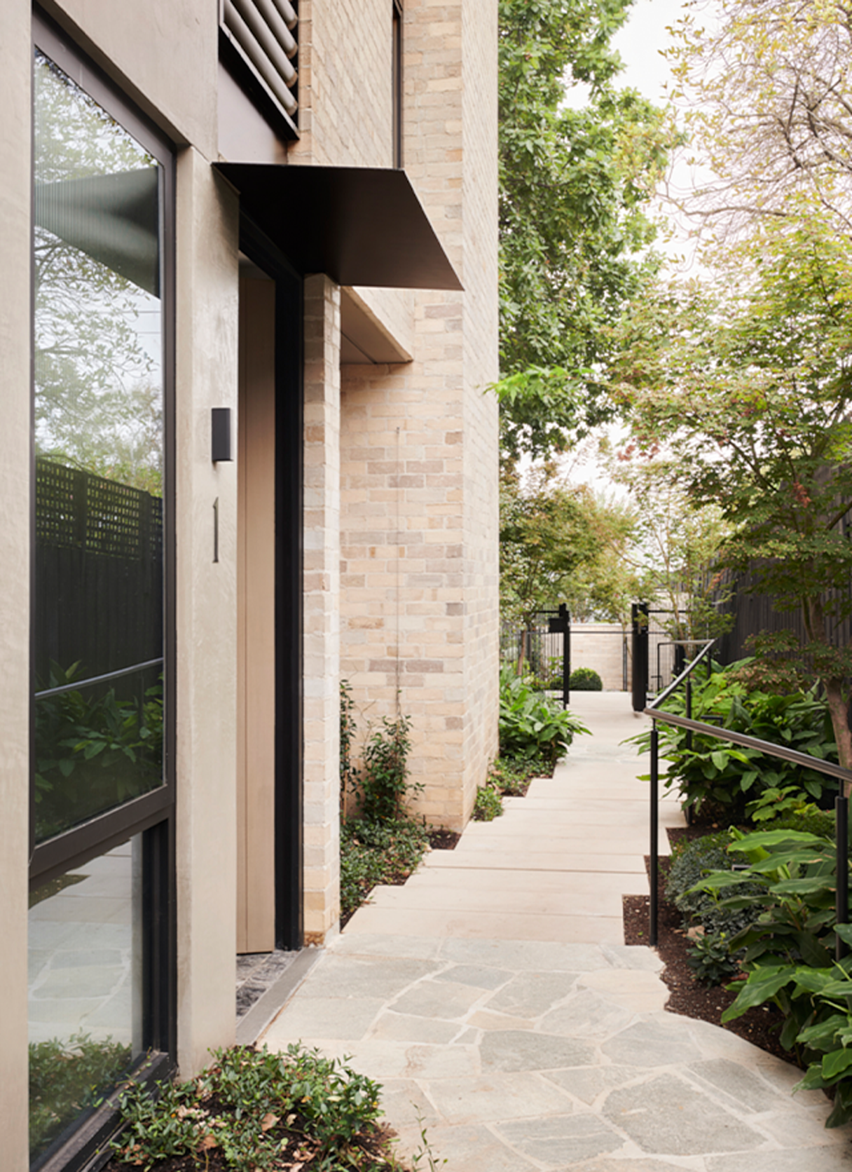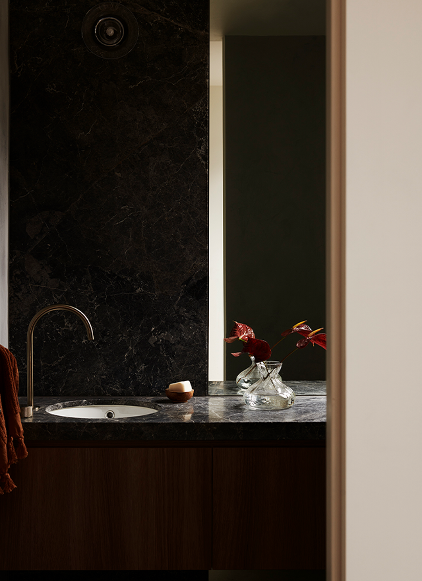 Despite its weathered state, the homestead possessed a captivatingly handcrafted aesthetic, evident in every detail – from the rugged elegance of the stone steps at the entry, to the intricate timberwork and stone masonry framing grand fireplaces, to the ornate ceiling roses overhead. As a unique point of difference, the interior design for the new residences immortalises the history of the previous home, through subtle design cues in contemporary form. Reflecting the architectural tapestry of Hawthorn, the design fosters a seamless interplay of textures from entry to the elegantly appointed powder room.